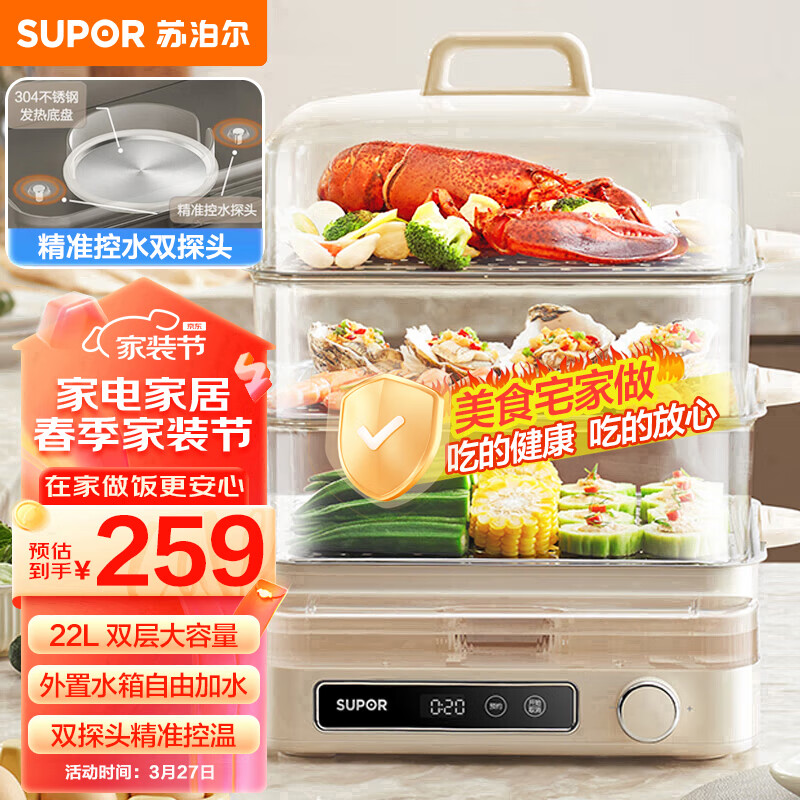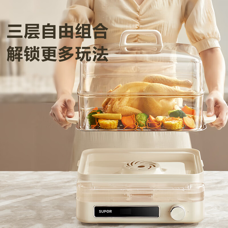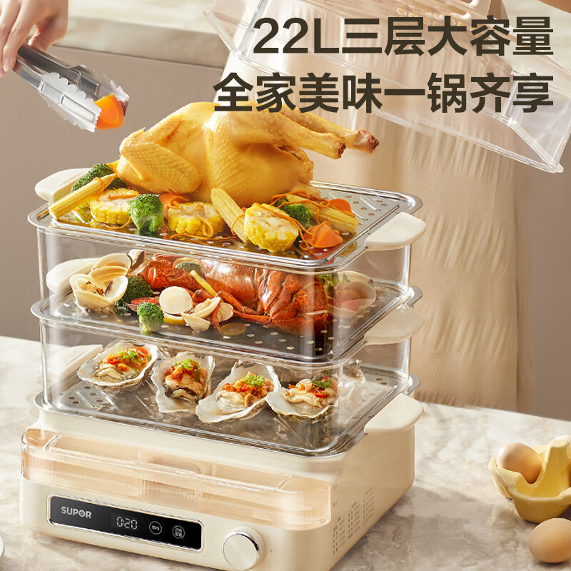 苏泊尔(SUPOR)电蒸锅 家用大容量电蒸箱 多功能蒸包子锅 多层蒸汽锅 全透明视窗不锈钢蒸片22L多用途锅ZN32FC839价格:269.00元!