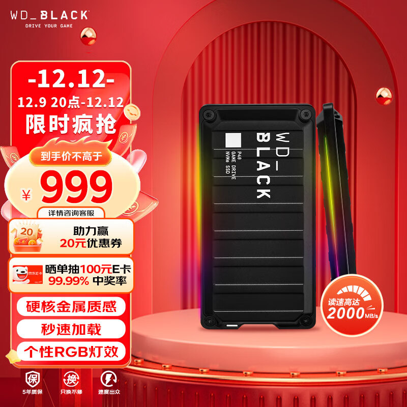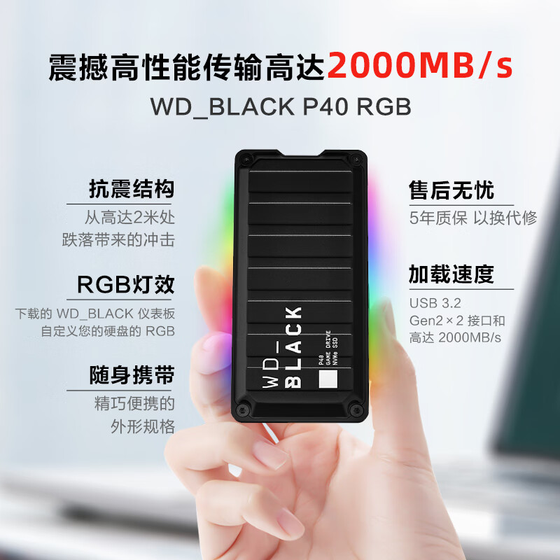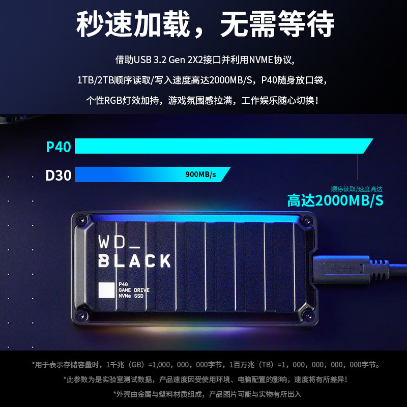 西部数据(WD)2TB NVMe 移动固态硬盘(PSSD)P40 type-c 游戏硬盘ssd外接ps4/5手机笔记本拓展存储2000MB/s价格:999.00元!