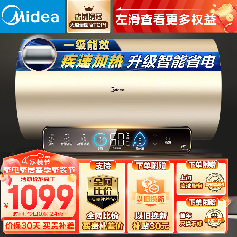 美的(Midea)家用80升3300W大功率电热水器速热大水量健康水质监测珐琅无缝内胆一级能效智能省电F8032-JE3(HE)价格:1299.00元!