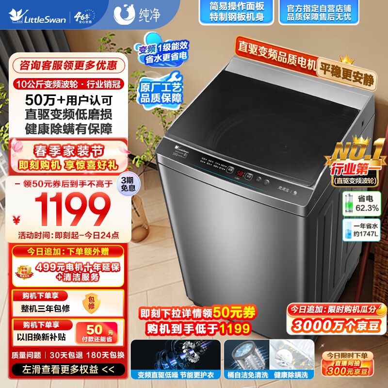 小天鹅(LittleSwan)波轮洗衣机全自动 直驱变频 10公斤大容量 免清洗不脏桶 升级除螨 以旧换新 TB100V23DB价格:1249.00元!
