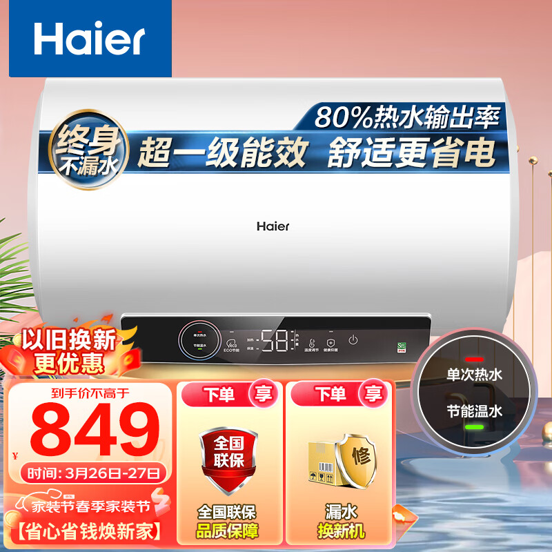 海尔(Haier)50升【安心浴】电热水器家用储水式 2200W节能高效加热 一级能效长效保温节能舒适省电 EC5001-GC3价格:849.00元!