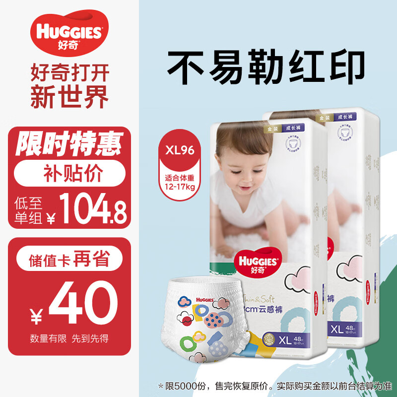 好奇(Huggies)金装成长裤XL96片(12-17kg)加大号婴儿尿不湿超薄柔软透气价格:110.80元!
