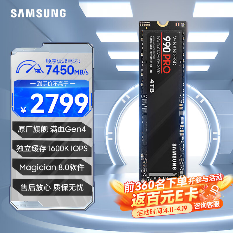三星(SAMSUNG)4TB SSD固态硬盘 M.2接口(NVMe协议PCIe 4.0 x4) AI电脑配件 读速7450MB/S 990 PRO价格:2799.00元!