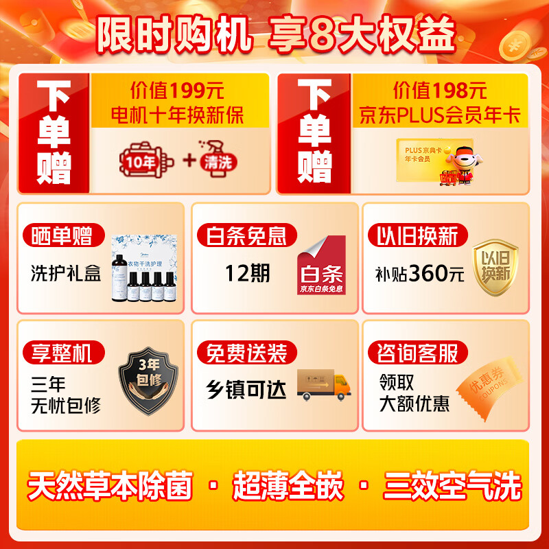 美的(Midea)滚筒洗衣机全自动 AIR3 元气轻氧系列 MD100LAIR 洗烘一体机 天然草本除菌 超薄全嵌 1.1洗净比价格:3498.00元!