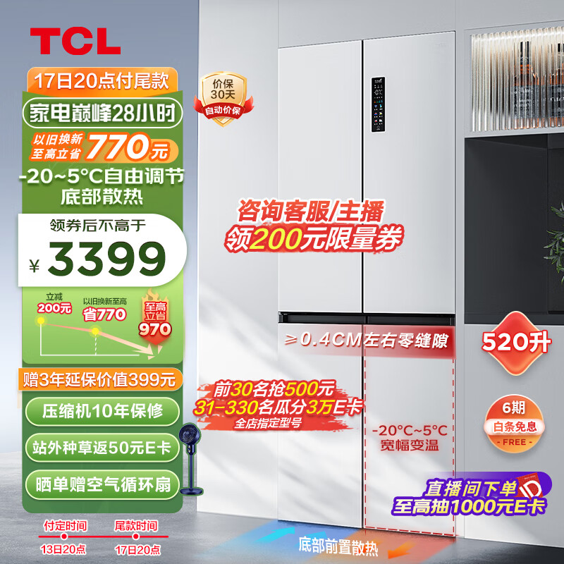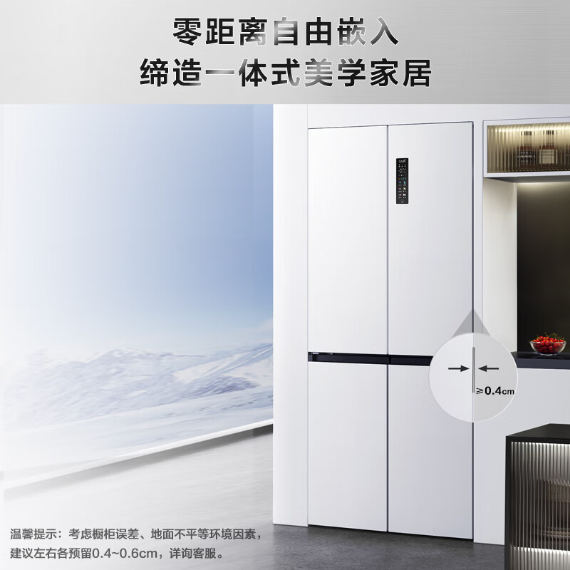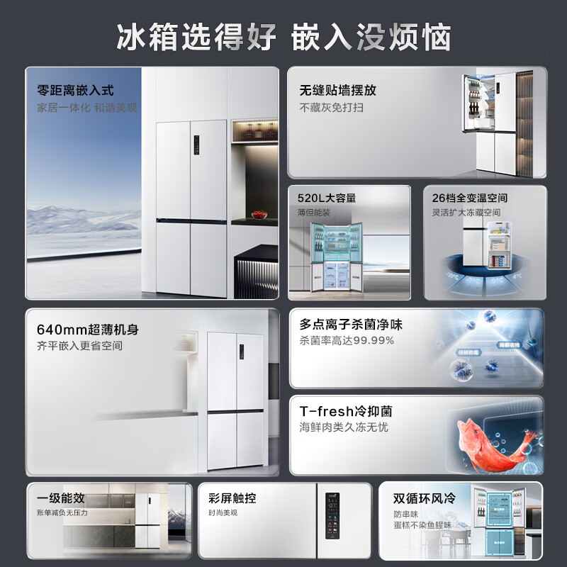 TCL 超薄零嵌系列520L十字四开门超薄嵌入式大容量家用白色电冰箱一级变频底部散热双循环R520T9-UQ价格:3798.00元!