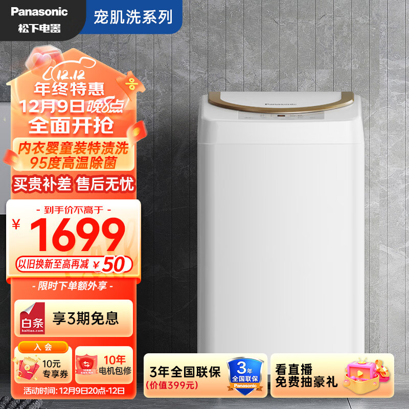 松下(Panasonic)波轮洗衣机全自动3.2公斤 迷你母婴洗适用 内衣仿手洗 健康除菌洗 筒自洁 宠肌洗系列 XQB32-P3G21价格:1799.00元!