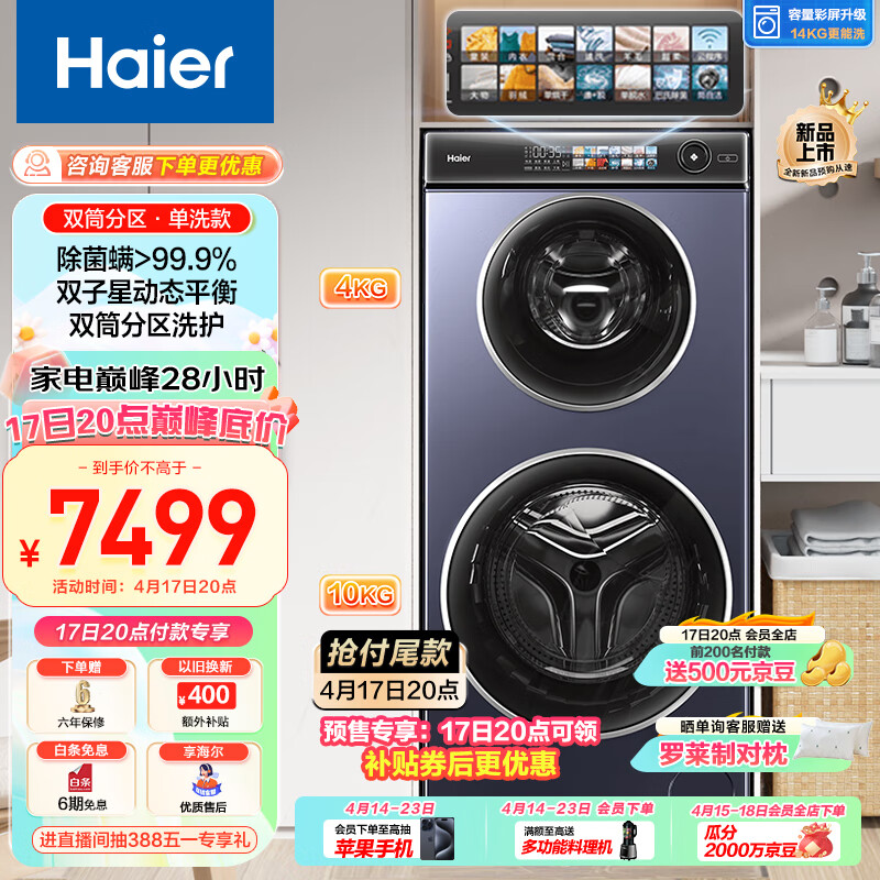 海尔(Haier)滚筒洗衣机全自动 家用双子双筒分区 4+10公斤超大容量【XQGF140-B1268U1】儿童母婴内衣 以旧换新价格:7999.00元!
