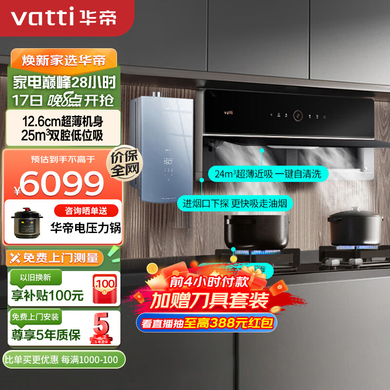 华帝(VATTI)抽油烟机超薄近吸双腔24风量吸油烟机灶具热水器套装家用多件套 i11172+90B+70-16(天然气)价格:6098.00元!