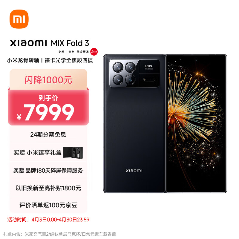 小米MIX Fold 3 小米龙骨转轴 徕卡光学全焦段四摄 12GB+256GB 月影黑 5g手机 折叠屏 小米汽车互联价格:7999.00元!