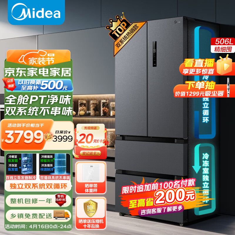 美的(Midea)532法式多门四开门电冰箱变频一级能效家用无霜双系统双循环大容量智能MR-532WFPZE价格:4299.00元!