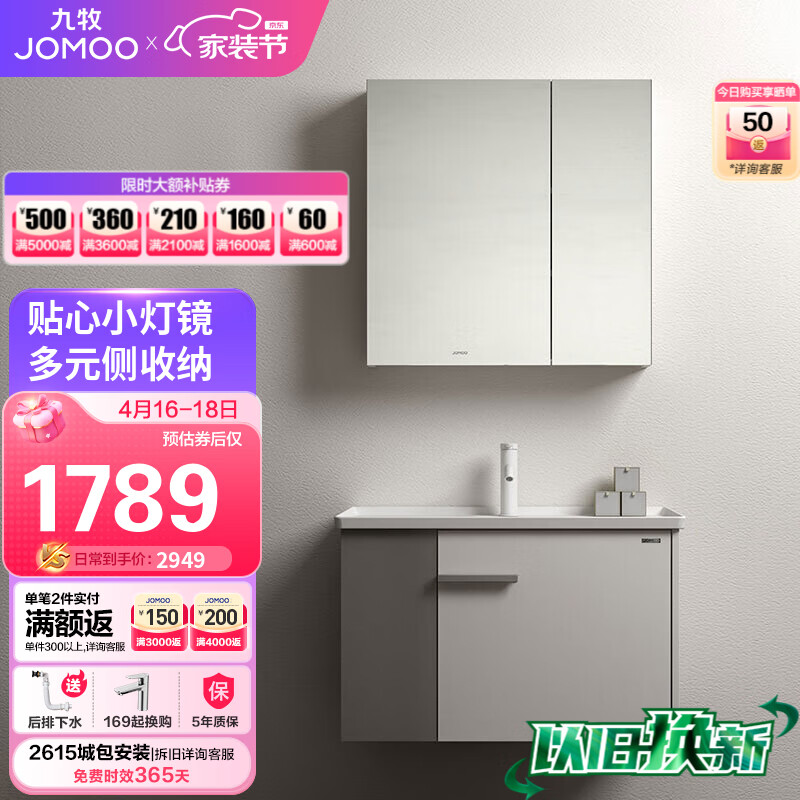 九牧(JOMOO)浴室柜陶瓷一体盆奶油风洗脸盆柜组合左侧收纳80cm A2717-147H-1价格:2399.00元!