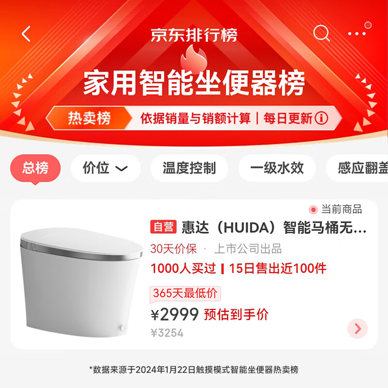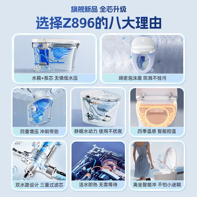 惠达(HUIDA)智能马桶泡沫盾带水箱无水压限制一体式坐便器HDZB-Z896 400坑距价格:3609.00元!