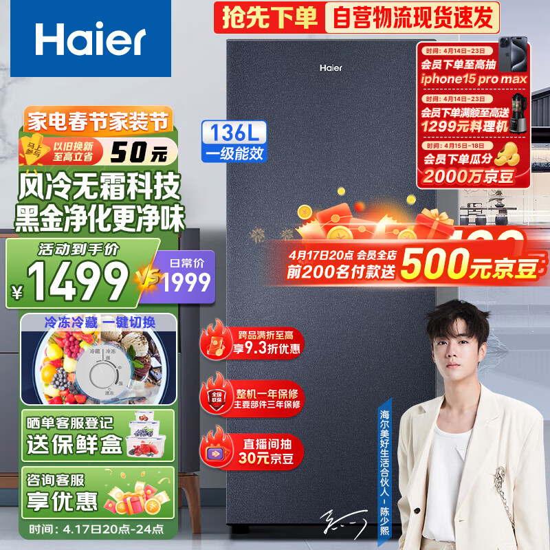 海尔(Haier)国瓷系列136升风冷家用立式冷藏冷冻柜抽屉式冷柜小冰柜家用小冰箱BD-136WGHB9D以旧换新价格:1498.00元!