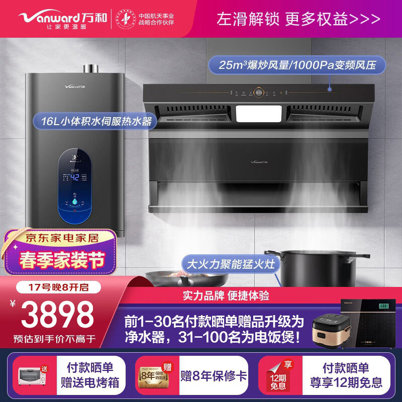 万和(Vanward)烟灶热三件套 三腔7字型大吸力1000Pa变频油烟机燃气灶具热水器 WL860+C5L90S+ME5D16(天然气)价格:3998.00元!