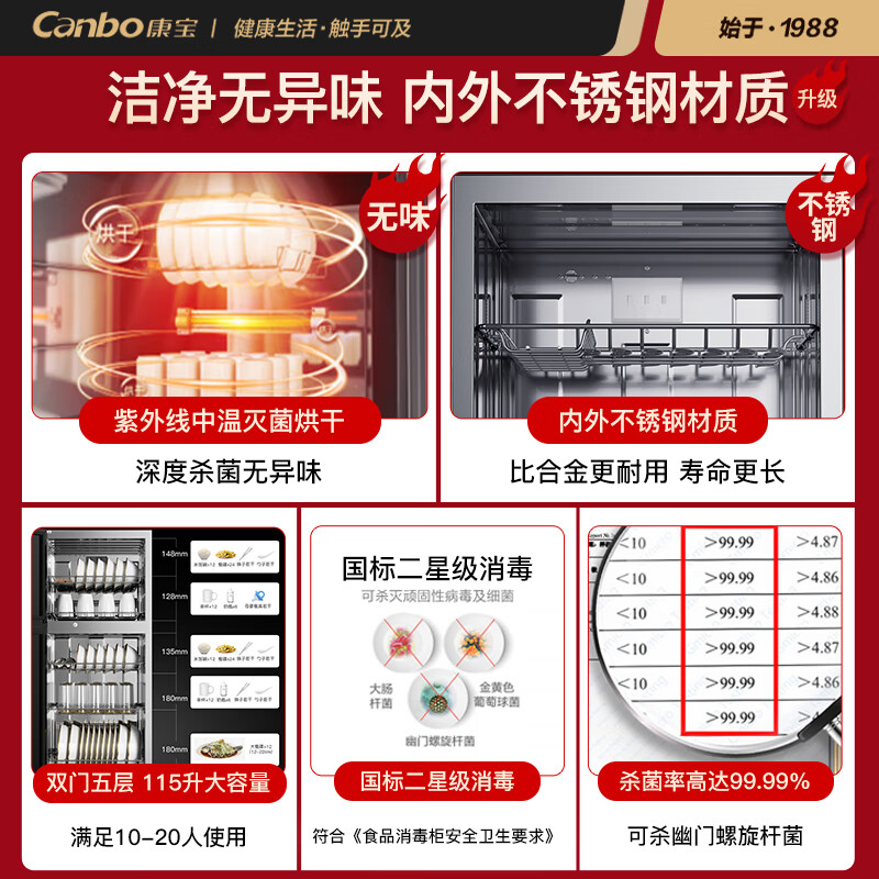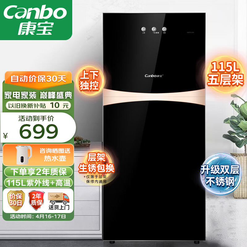 康宝(Canbo)消毒柜家用立式 小型双门消毒厨房碗柜碗筷收纳柜 母婴儿奶瓶茶杯消毒机器紫外线二星 XDZ115-G19价格:749.00元!