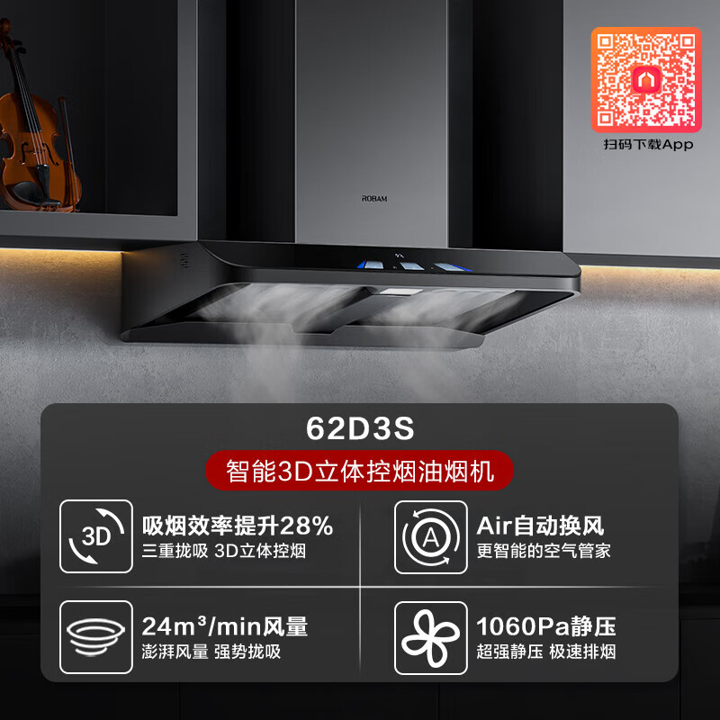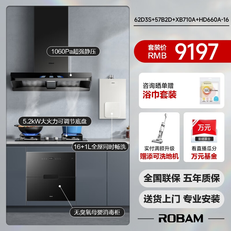 老板(Robam)抽油烟机厨房多件套 钢琴家D3S欧式24风量燃气灶具消毒柜热水器62D3S+57B2DT+XB710A+HD660A-16价格:9196.00元!