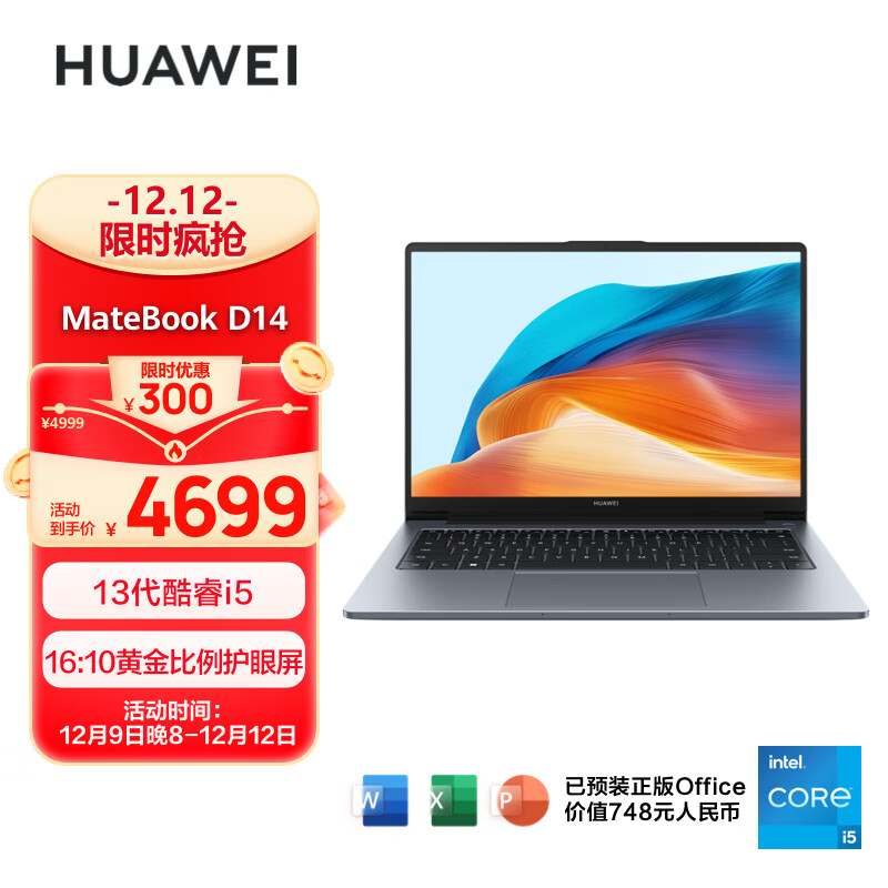 华为(HUAWEI)笔记本电脑MateBook D 14 2023 13代酷睿版 i5 16G IT 轻薄办公本/14英寸护眼屏/手机互联 深空灰价格:4699.00元!
