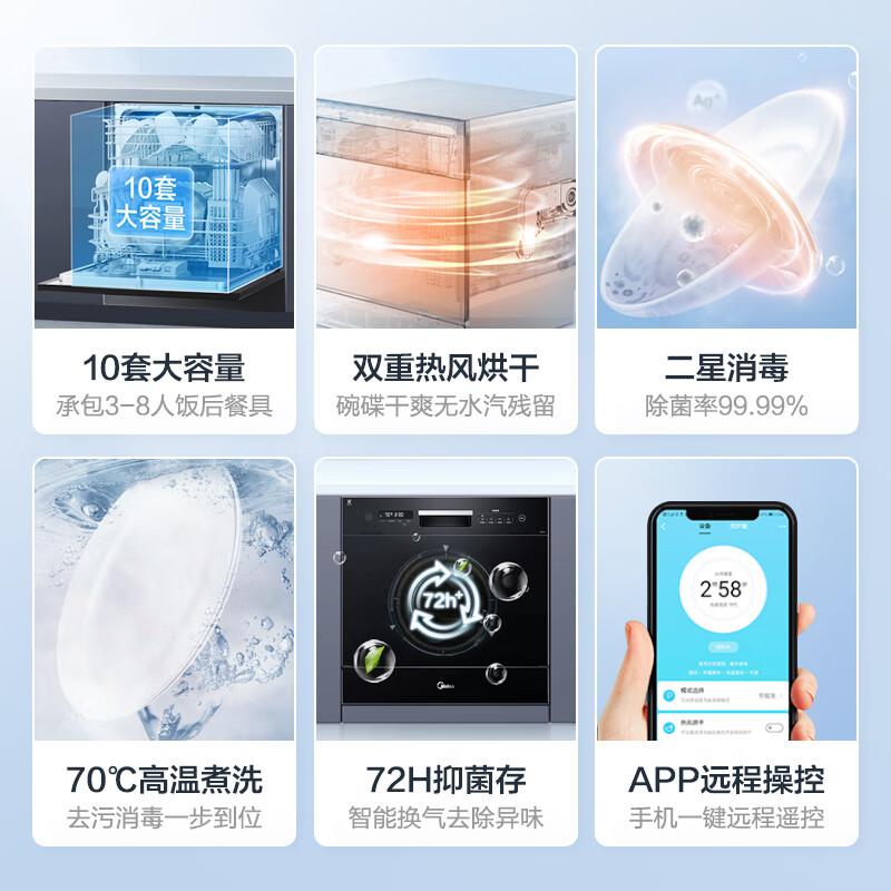 美的(Midea)10套洗碗机嵌入式台式 二消毒 热风烘干 除菌99.99% 72h储存 洗碗机消毒一体机3905 Pro价格:3999.00元!