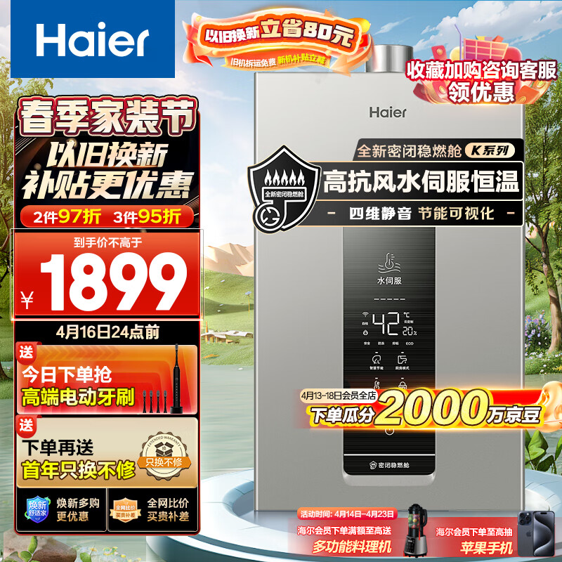 海尔(Haier)13升【K系列KL3】燃气热水器天然气 水伺服恒温 一级静音 全新密闭稳燃舱高楼层适用JSQ25-13KL3U1价格:1899.00元!