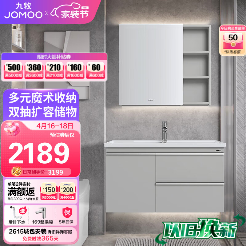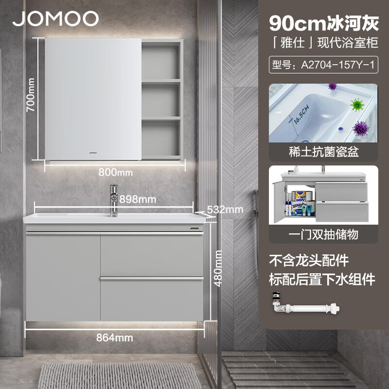 九牧(JOMOO)浴室柜陶瓷一体盆卫生间洗脸洗手盆组合套装柜90cm A2704-157Y-1价格:2849.00元!