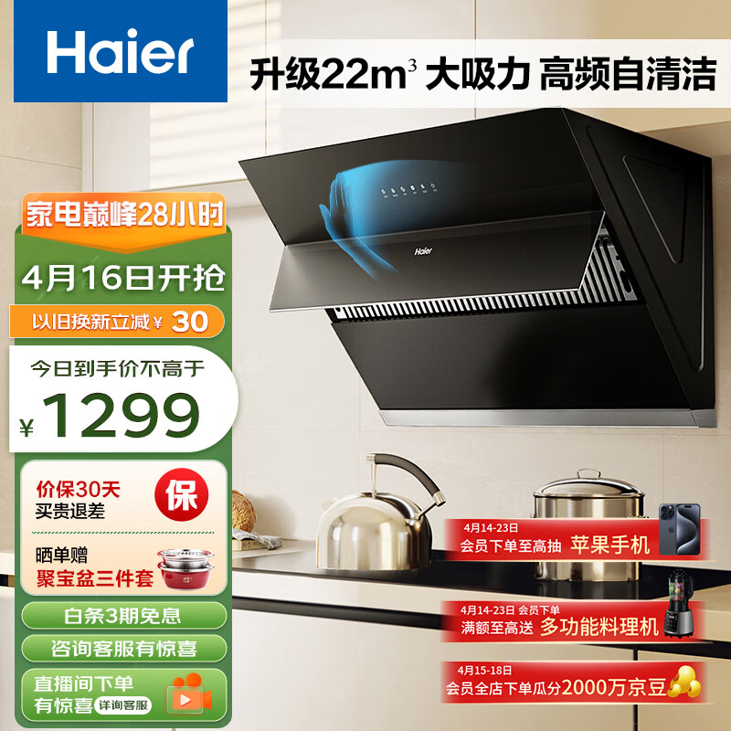 海尔(Haier)抽油烟机 侧吸式油烟机 22m3/min大吸力 挥手智控 自动清洗 自动开合家用油烟机MA2C1价格:1299.00元!