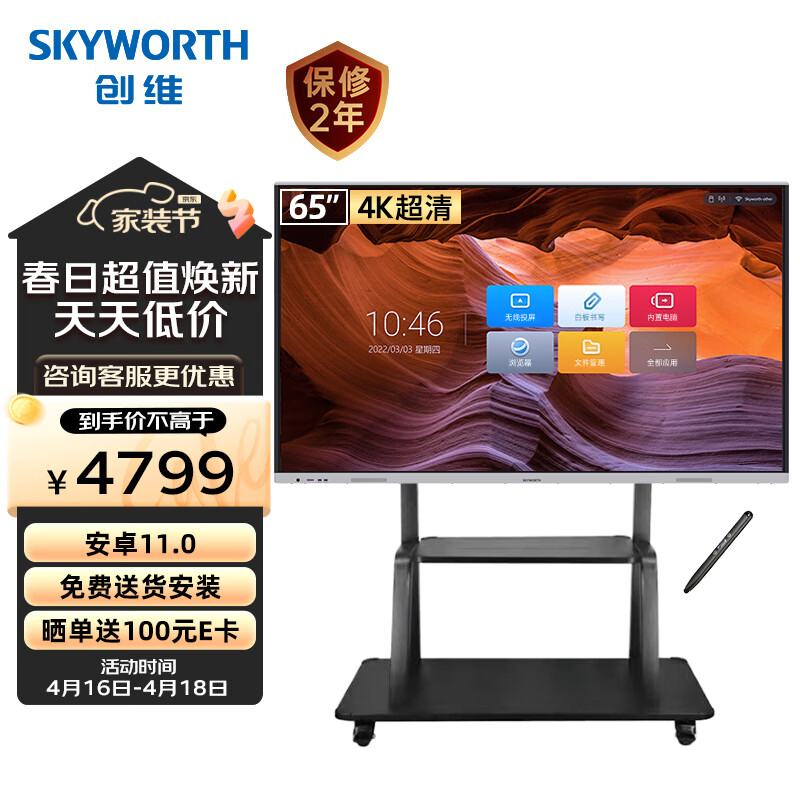 创维(Skyworth)65英寸会议平板 智能触控一体机 电子白板 无线传屏投影 视频触摸电视【商用显示】65DSH5移动支架价格:4799.00元!