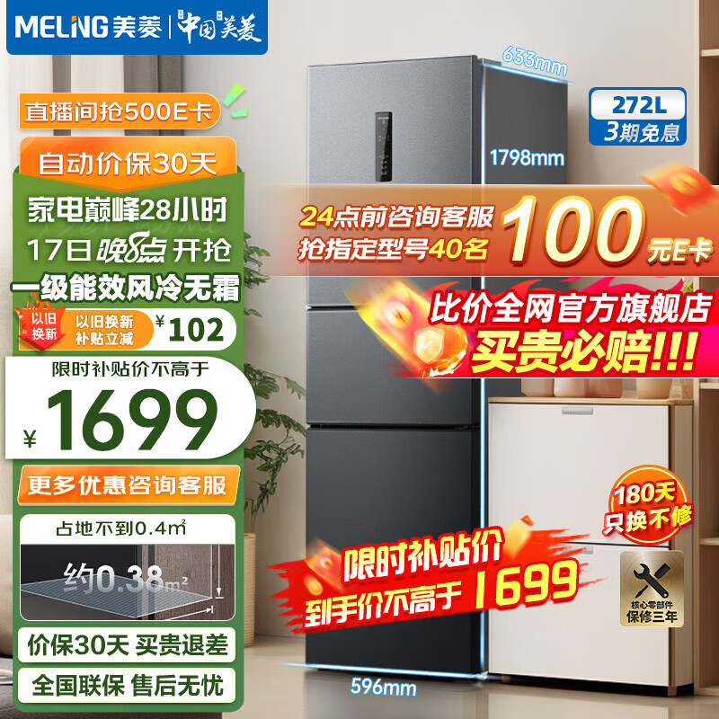 美菱(MeiLing)【离子净】272升三门小冰箱超薄嵌入一级能效变频小型家用大冷冻风冷无霜宿舍租房不串味迷你冰箱 BCD-272WP3CX 神秘灰价格:1697.00元!