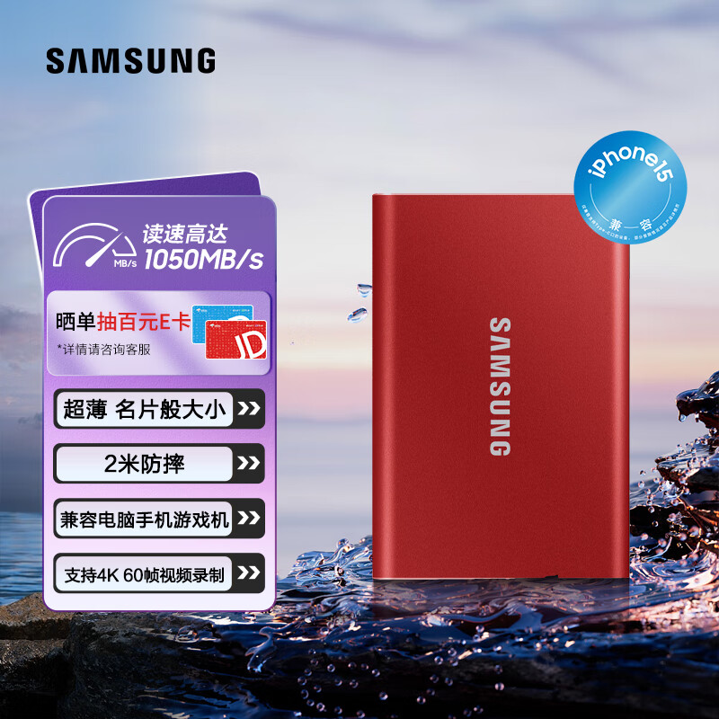 三星(SAMSUNG) 1TB Type-c USB 3.2 移动固态硬盘(PSSD) T7 红色 NVMe传输速度1050MB/s 超薄时尚价格:1029.00元!