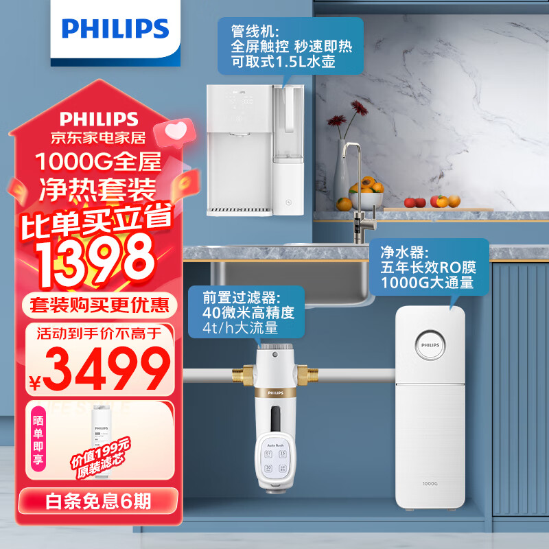 飞利浦(PHILIPS)家用净水器 全屋前置管线机加热净水器套装【引擎1000G+管线机ADD4826+前置过滤器AWP1836】价格:3499.00元!
