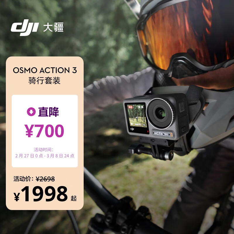 大疆 DJI Osmo Action 3 骑行套装 运动相机 4K增稳户外vlog相机骑行头戴摄像机行车记录仪+128G内存卡价格:2087.90元!