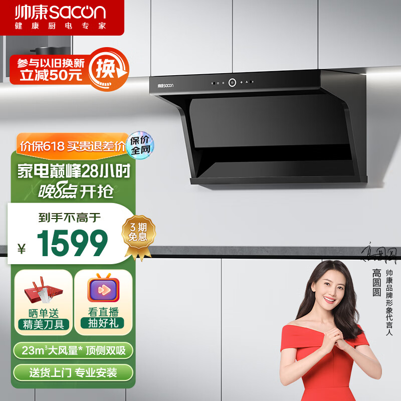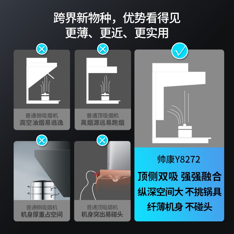 帅康(Sacon)抽油烟机顶侧双吸油烟机 家用23大风量7字机 挥手智控 自动清洗 Y8272价格:1599.00元!