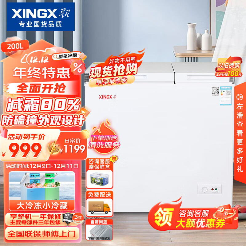 星星(XINGX) 200升 微霜商用卧式冰柜 左冷冻右冷藏卧式冰箱 顶开门双温双箱减霜80%冷柜 BCD-200GE价格:1049.00元!
