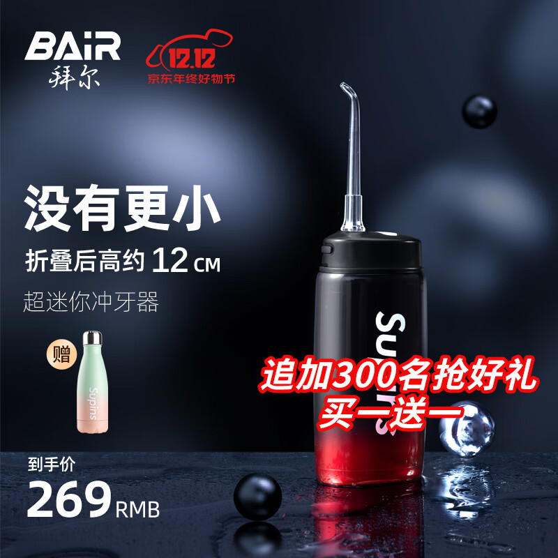 拜尔(BAIR)V2小不点 迷你冲牙器 便携式正畸电动洗牙器家用洁牙水牙线冲洗器 送女男朋友礼物 酷爽黑(4枚原装喷嘴,折叠后约12厘米)价格:329.00元!
