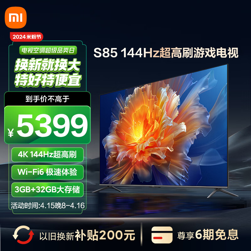 小米电视S85 85英寸4K 144Hz超高刷全速旗舰游戏电视 WiFi 6 3GB+32GB智能电视L85MA-S以旧换新价格:4899.00元!