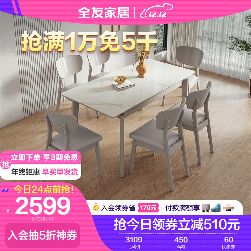全友家居 餐桌现代简约岩板餐桌长短伸缩功能餐桌长方形桌子DW1120价格:3109.00元!