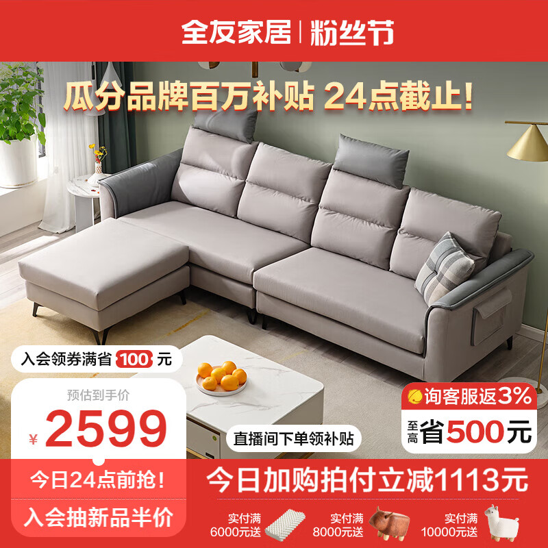 全友家居 北欧科技布艺四人沙发直排式简约一字沙发客厅大户型102567价格:3712.86元!