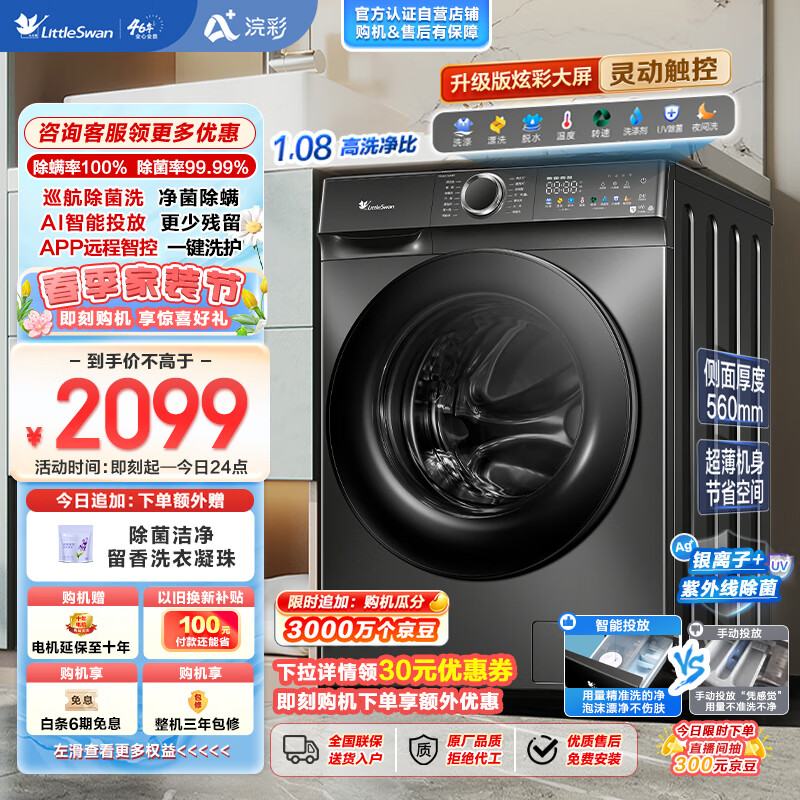 小天鹅(LittleSwan)滚筒洗衣机全自动 浣彩系列 10KG大容量 巡航除菌 彩屏智能投放 1.08洗净比 TG100VT6XR17价格:2099.00元!