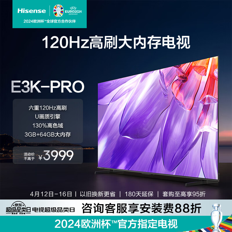 海信电视75E3K-PRO 75英寸 4K六重120Hz高刷 130%高色域 U画质引擎 智慧屏 液晶平板电视机 以旧换新价格:3809.00元!