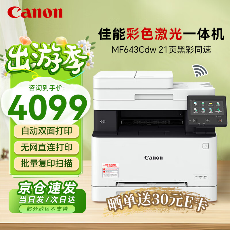 佳能(Canon)MF643Cdw A4彩色无线wifi激光打印机一体机 办公商用 批量复印扫描/自动双面/铜版纸打印价格:4099.00元!