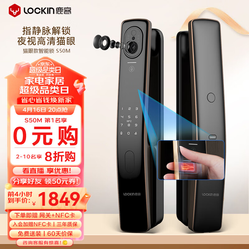 鹿客(lockin)S50M可视猫眼指静脉智能门锁密码指纹电子锁支持APP智联价格:1848.00元!