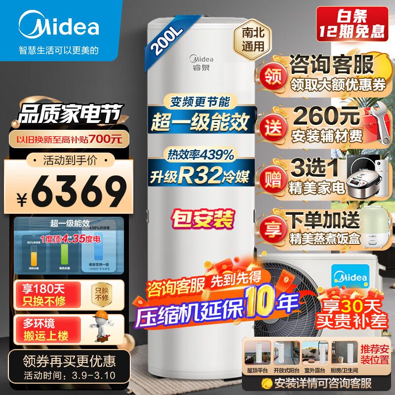 美的(Midea)空气能热水器200升包安装 一级能效75℃高水温R32冷媒带电辅RSJF-V33/RDN8-X1-200-(E1)(4-6人)价格:6699.00元!