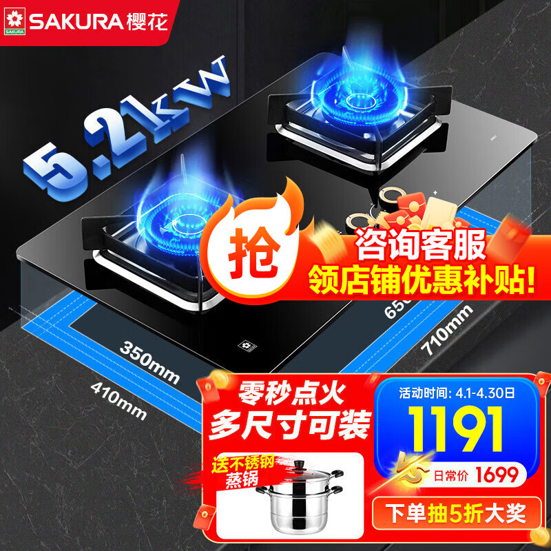 樱花(SAKURA)燃气灶天然气灶大火力液化气灶具家用双灶一级能效嵌入式台式零秒瞬时点火大面板 JGE01【天然气】5.2KW猛火灶多开孔尺寸安装价格:1191.00元!