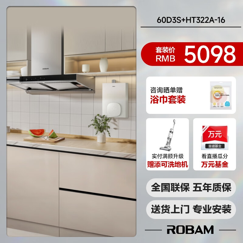老板(Robam)抽油烟机D3S欧式顶吸式双腔变频挥手24风量吸油烟机16升恒温燃气热水器家用强排式60D3S+HT322A-16价格:5098.00元!