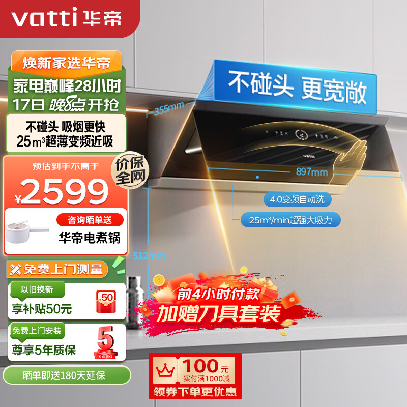 华帝(VATTI)抽油烟机侧吸式家用超薄变频吸油烟机顶侧一体新侧吸25立方大吸力挥手智控自清洁脱排油烟机i111A2价格:2598.00元!