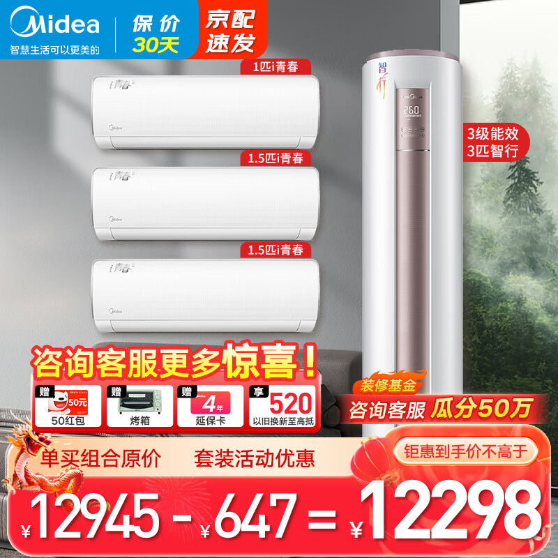 美的空调套装 变频冷暖 壁挂式立柜空调一套购齐 双节能低噪大风量 i青春挂机+智行柜机 三室一厅价格:12298.00元!
