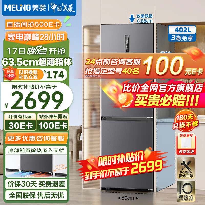 美菱(MeiLing)冰箱402升双门两门冰箱一级能效变频风冷无霜超薄嵌入大容量可拼接无缝窄门家用电冰箱 BCD-402WPCZX 神秘灰价格:2899.00元!