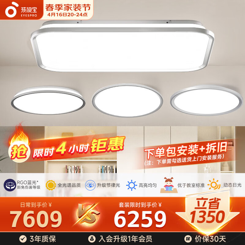 孩视宝【三室一厅】护眼吸顶灯客厅大灯儿童房卧室灯全光谱灯具套餐价格:7609.00元!