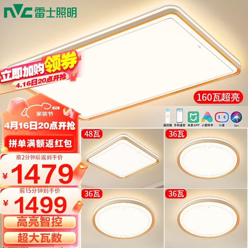 雷士(NVC)LED吸顶灯 简约大尺寸客厅书房卧室灯具 大瓦数AI智控灯饰 悦梦I价格:2373.00元!