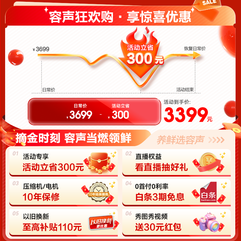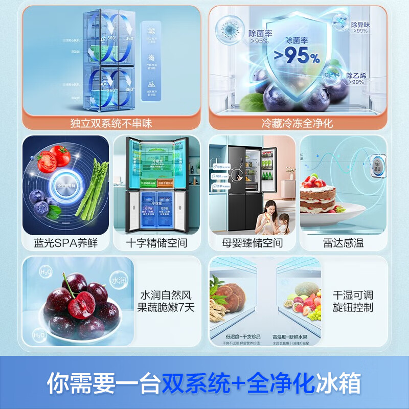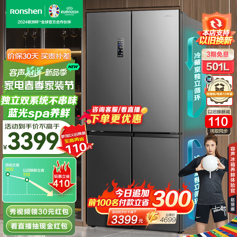容声(Ronshen)501L双循环十字对开双开门家用风冷无霜变频一级能效大容量嵌入式四开门电冰箱独立双系统离子净味价格:3699.00元!