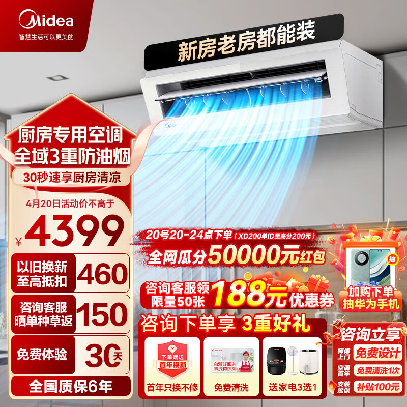 美的(Midea)厨清凉 厨房空调 专用吸顶式 1.5匹变频 防油烟 大冷量 易安装CKF-35XW/BN8Y-XD200【极地白】价格:4399.00元!